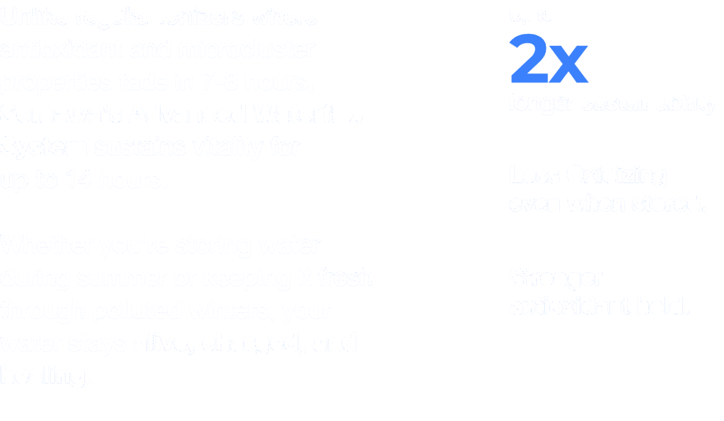 It ensures a steady reserve of purified and ionized water even during power cuts or low-pressure supply, making it ideal for families with high daily water consumption. This provides uninterrupted access to clean water at all times.